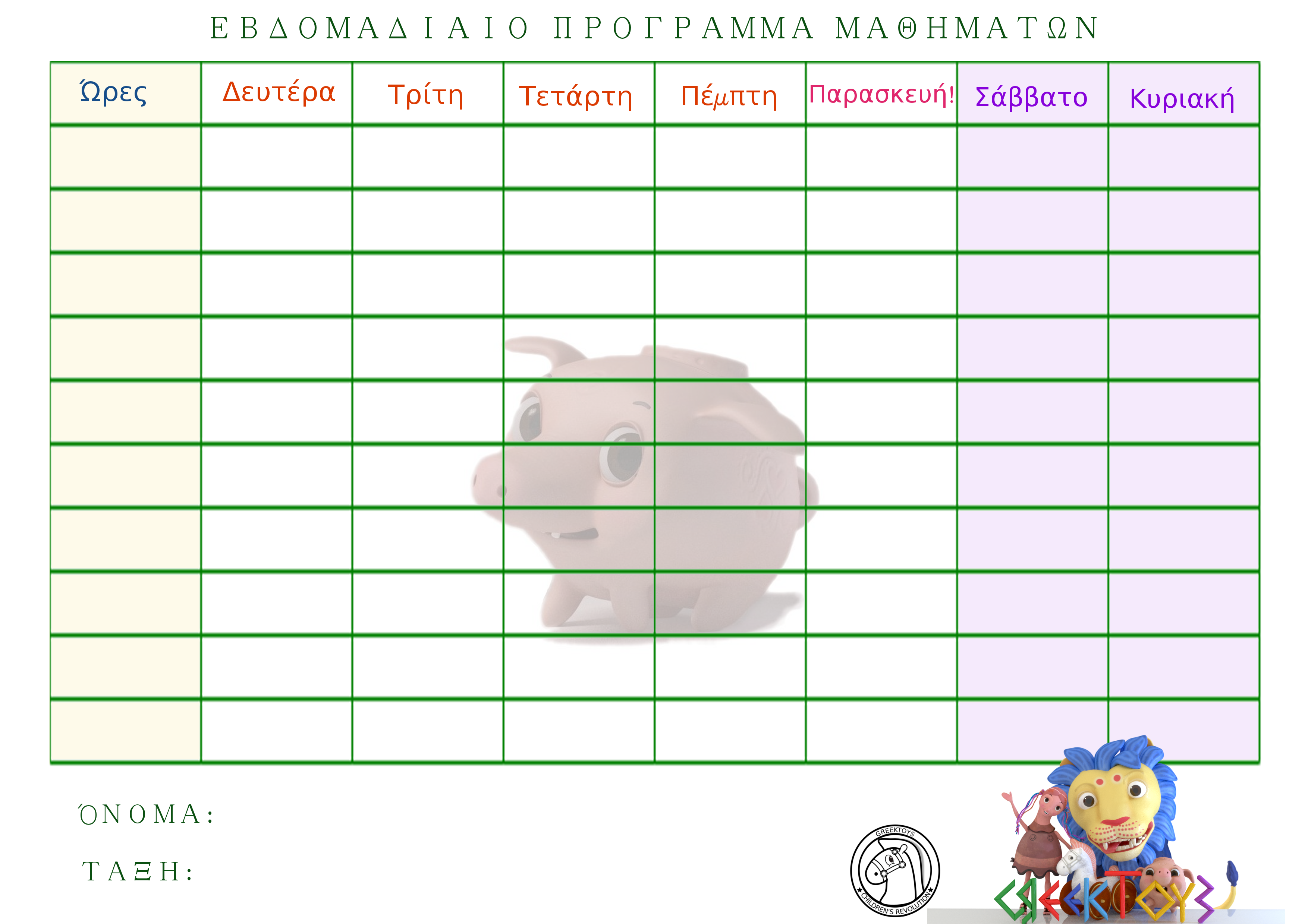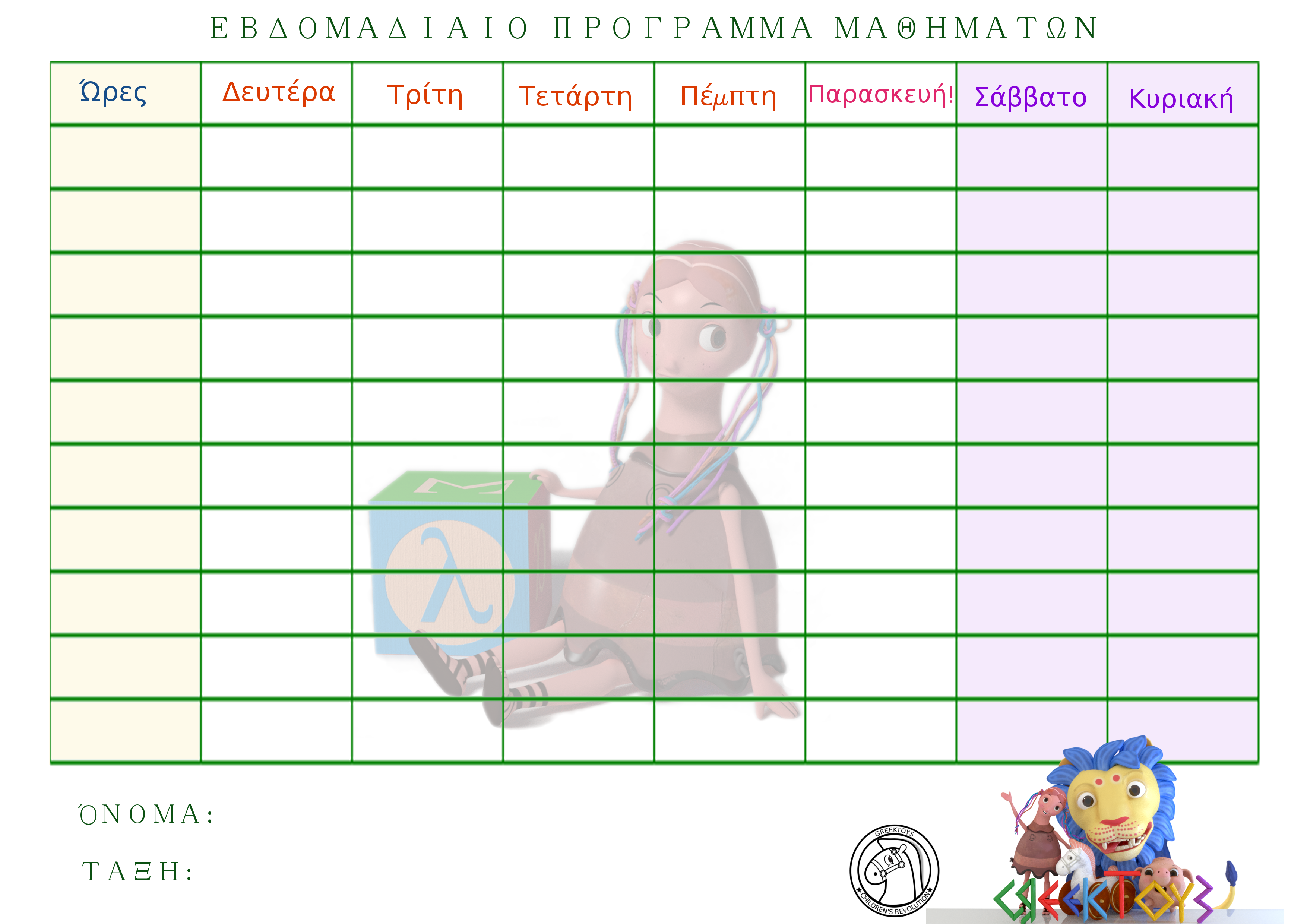 Για τη νέα σχολική χρονιά, μπορείτε να κατεβάσετε και να εκτυπώσετε τα σχολικά εβδομαδιαία προγράμματα με τους πρωταγωνιστές του Greektoys! Κάντε δεξί κλικ πάνω στην εικόνα και μετά ‘save image as…’. Οι εικόνες έχουν σχεδιαστεί για να μπορούν να εκτυπωθούν με χαμηλή κατανάλωση μελανιού διατηρώντας την ποιότητα της εικόνας.