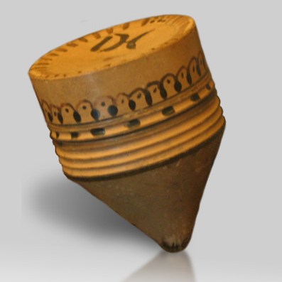 Another skill toy was the “strombos”, that is, our modern tops. There were many variations of spinning tops, with lots of different shapes and colours. The easiest way to play was to try turning the top with your hand. In another variation, the player used to spin it with the help of a small whip, as we can see in this Greek vase from the 5th century BCE.
