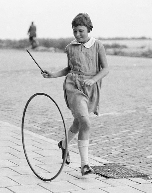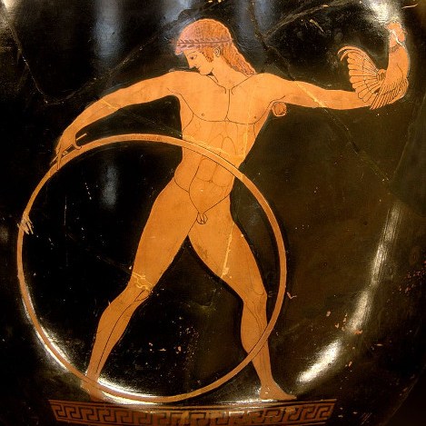 It was a popular form of recreation for young and old. Besides children’s game, hoop rolling (trochus) was practiced by men in palaestra as a training exercise. Hoops were made of metals, like bronze, iron or copper. Greek pottery representations usually show boys rolling a hoop with a stick. See the image below.