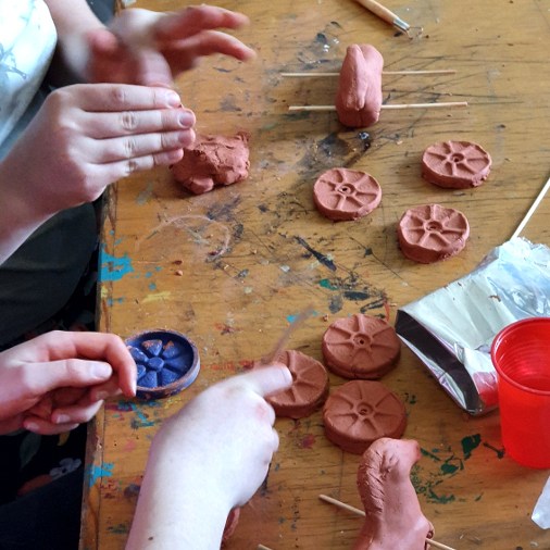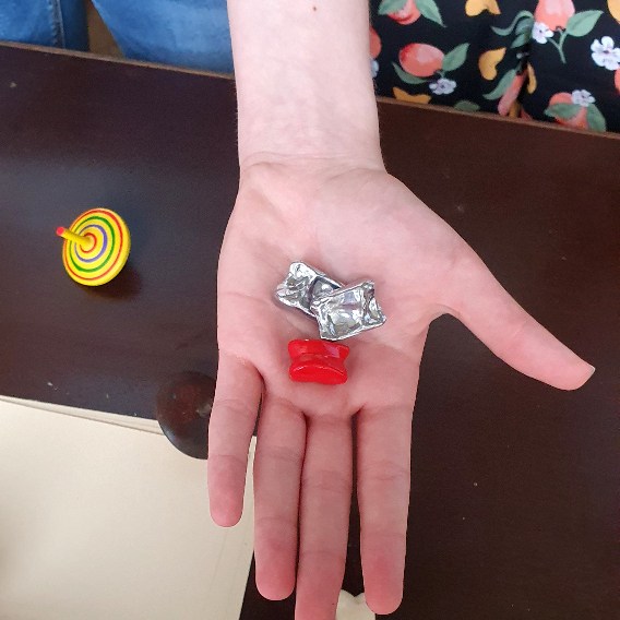 Στο τέλος της ξενάγησης, πήγαμε σε ένα «εργαστήριο» και προσπαθήσαμε να δημιουργήσουμε αντίγραφα αρχαίων παιχνιδιών.