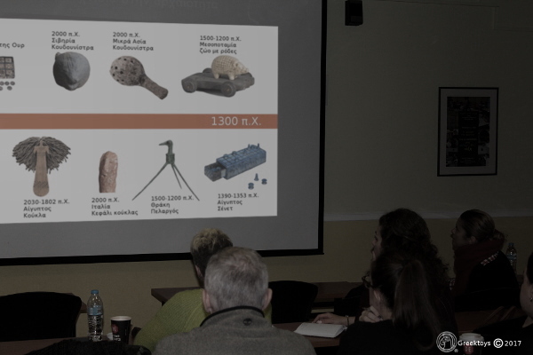 Στην Αρχαία Ελλάδα υπήρχε μεγάλη ποικιλία παιχνιδιών. Κάποια από αυτά τα παιχνίδια παραμένουν γνωστά ως τις μέρες μας. Κούκλες (πλαγγόνες), αστράγαλοι, σβούρες, γιογιό, κουδουνίστρες και ζωόμορφα παιχνίδια πάνω σε ρόδες είναι μερικά από αυτά που μας έχει φέρει η αρχαιολογική σκαπάνη. Στα εργαστήρια που διοργανώνει κατά καιρούς το Greektoys, μπορούμε να δούμε από κοντά αυτά τα παιχνίδια και να ανακαλύψουμε: Πώς έχουμε πληροφορίες για τα αρχαία παιχνίδια; Πώς έπαιζαν με αυτά; Ποιος ήταν ο τρόπος κατασκευής; Τί σχέση έχουν με τα σύγχρονα παιχνίδια; Και κυρίως, τα παιδιά φτιάχνουν τα δικά τους παιχνίδια!Ευρωπαϊκά επιμορφωτικά εργαστήρια